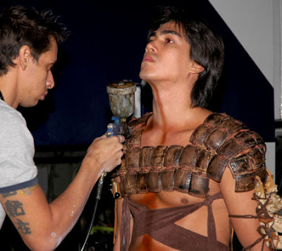 Formigão passa por outro processo. Depois de receber uma maquiagem que o deixa mais moreno, linhas marrons são pintadas em seu corpo com o aerógrafo